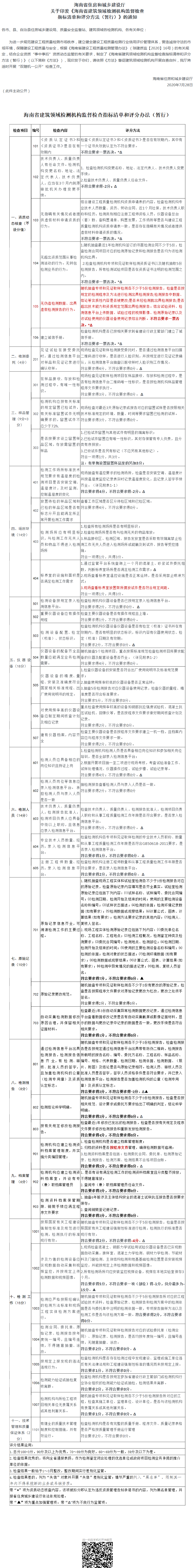 海南省住房和城鄉(xiāng)建設(shè)廳關(guān)于印發(fā)《海南省建筑領(lǐng)域檢測機構(gòu)監(jiān)督檢查指標清單和評分方法(暫行)》的通知